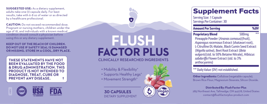 Flush Factor Plus contains unique ingredients combined in an easy-to-swallow capsule that maintains healthy fluid circulation in your system and legs, supporting your body’s natural ability to regulate fluids.